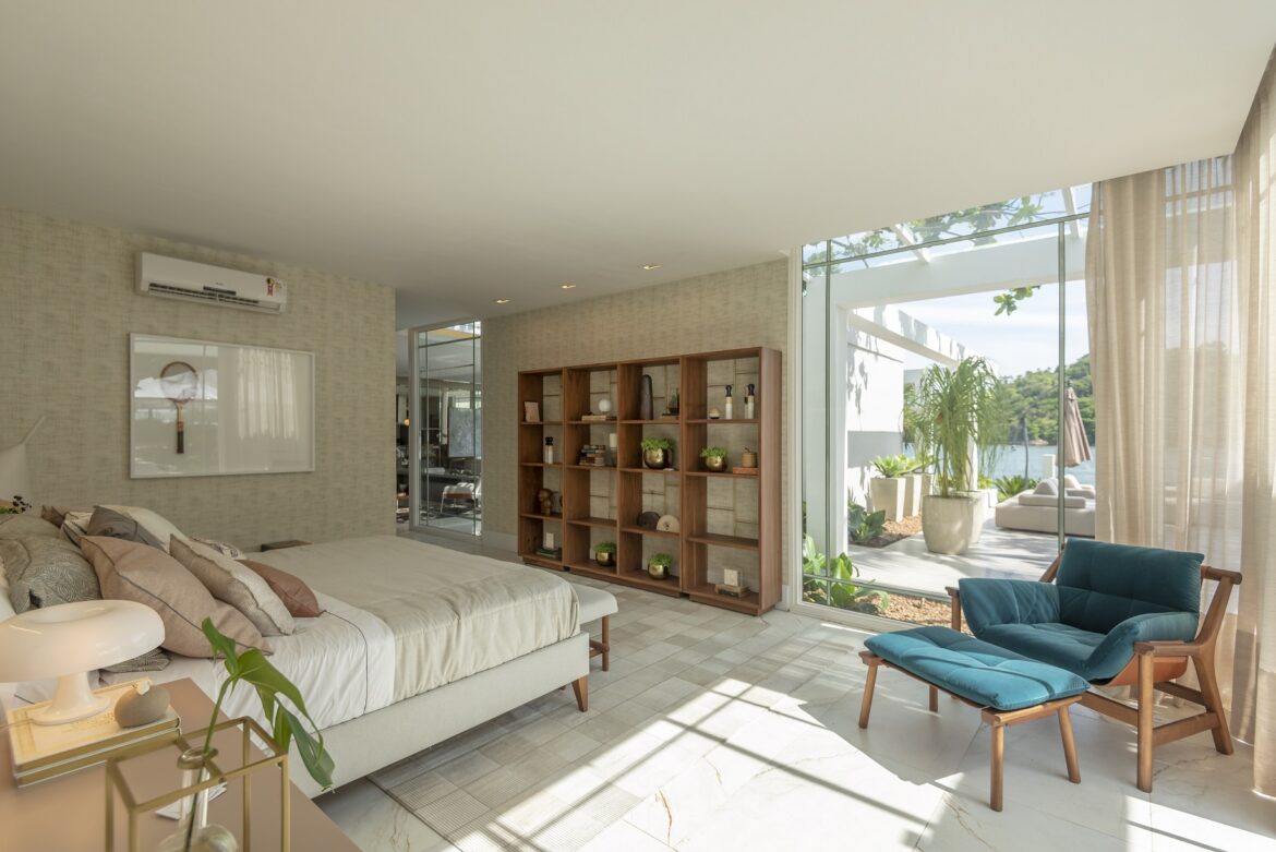 A arquiteta Cris Locatelli é uma apreciadora das estantes! Ela explica que esses elementos arquitetônicos geralmente são usados como recurso para substituir paredes e trazer movimento para os ambientes, atuando até como um divisor entre eles, delimitando um espaço sem deixá-los fechados. No entanto, a profissional ressalta que, agregado a isso, elas servem também para montar uma narrativa sobre os momentos vividos de quem ali reside, trazendo o foco para a essência do morador e sua personalidade.